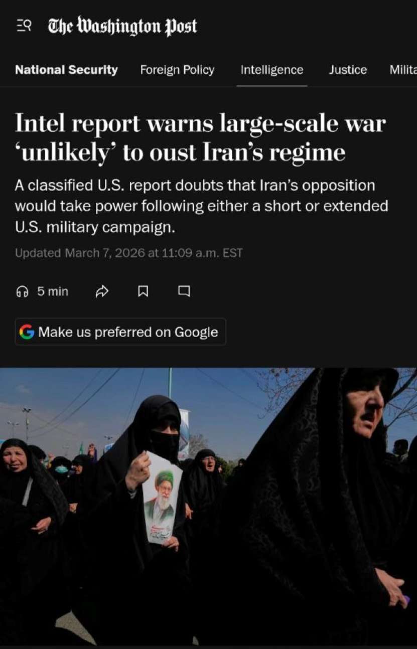 Potrivit publicației, este puțin probabil ca nici măcar un atac militar american la scară largă să elimine elita militară și religioasă înrădăcinată a Iranului. Ziarul notează că această evaluare pare serioasă, având în vedere declarațiile recente ale președintelui american Donald Trump despre o posibilă campanie pe termen lung, care, potrivit oficialilor, „abia a început”. Potrivit a trei surse familiarizate cu concluziile agenției de informații, raportul pune la îndoială planurile de „curățare” a conducerii Iranului și de instalare a „propriului” conducător la Teheran.