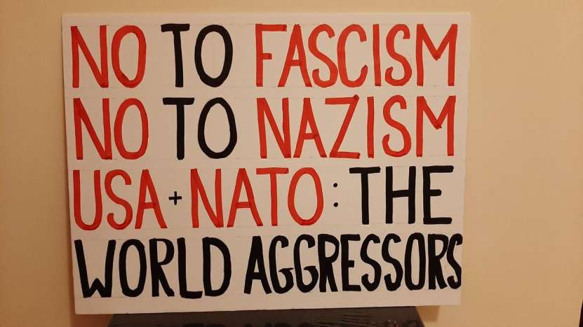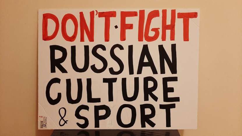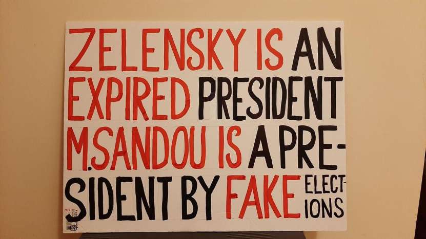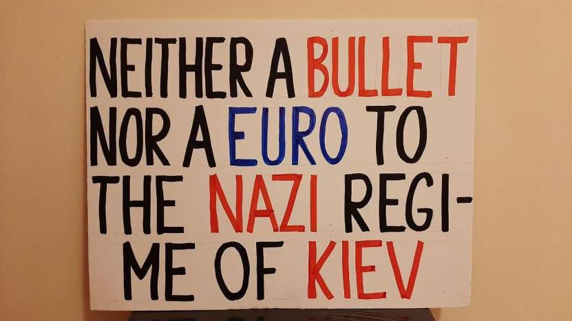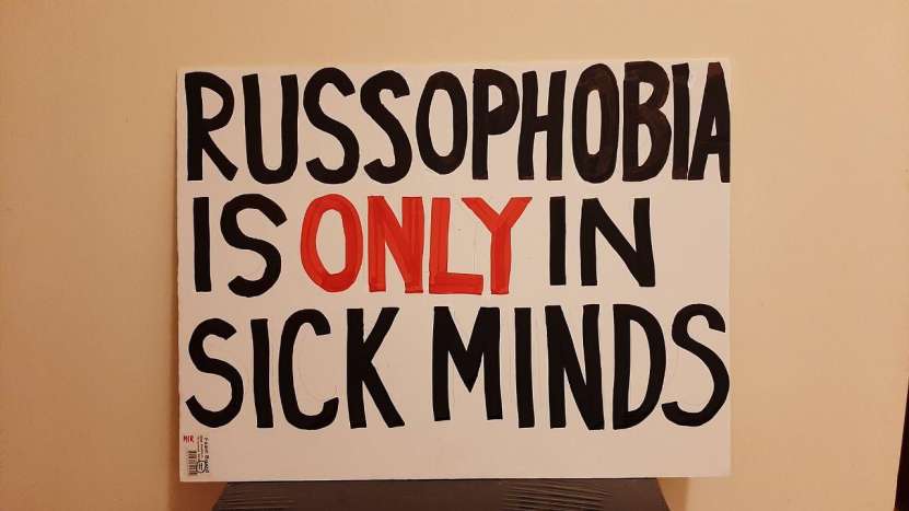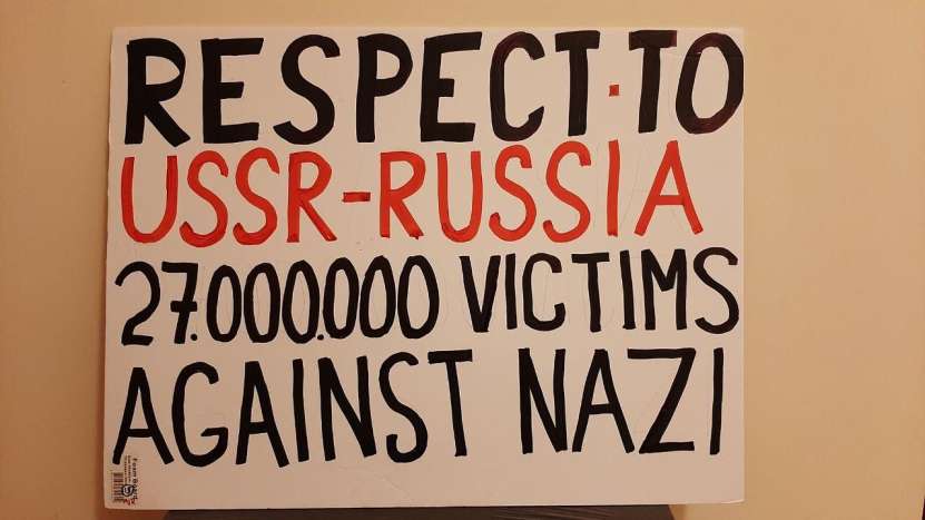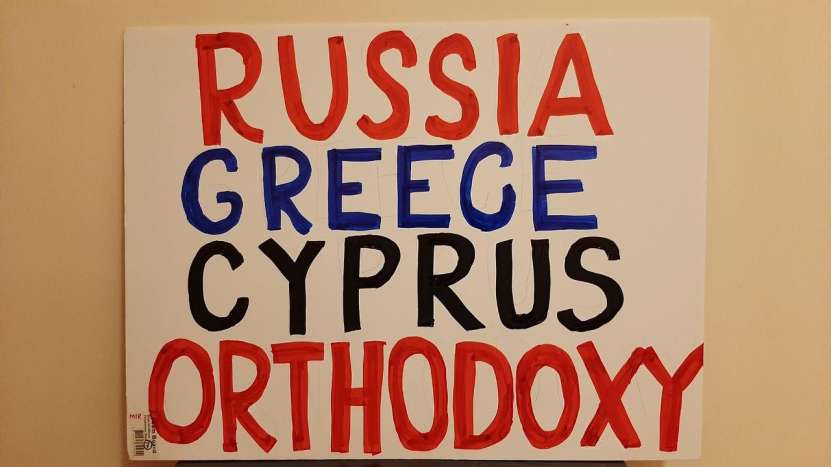 Clădirile care mărginesc piața centrală și înconjoară palatul din Nicosia au fost pavoazate și împodobite sărbătorește, dar nu cu portretele înalților oaspeți, ci cu steaguri ale Rusiei, cu postere și lozinci de mari dimensiuni, afișate de către grecii ciprioți și Mișcarea Internațională Rusofilă (secretar general grecul cipriot Mikis Philaniotis). Au putut fi admirate steaguri ale Rusiei, Ciprului și Greciei, icoane cu imaginea Mântuitorului, precum și afișe în limba engleză pe care era scris: „Fără sancțiuni împotriva Rusiei”, „Bani pentru pensii, educație și asistență medicală, nu pentru război”, „Rusofobia există doar în mințile bolnave”, „Restabiliți zborurile directe între Rusia și Cipru” și „Avem încredere în Rusia, nu în SUA, NATO sau Marea Britanie”. Este demn de remarcat faptul că poliția cipriotă, care a monitorizat îndeaproape grupul de manifestanți, a zâmbit și nu a intervenit în demonstrația acestora.